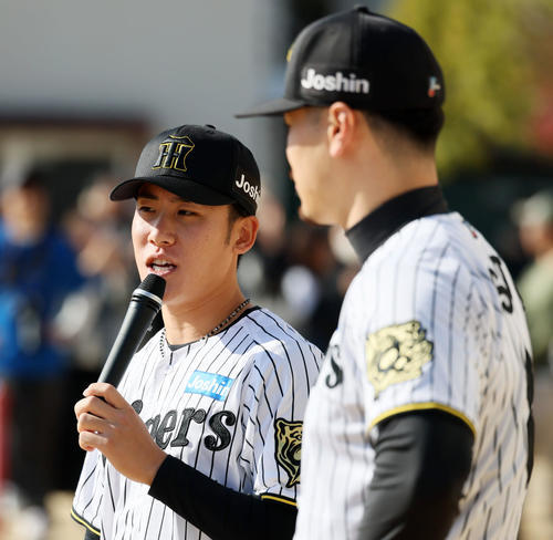 「佐藤輝明後援会」が主催する野球教室に参加しあいさつする富田。右は佐藤輝(撮影・加藤哉)阪神富田蓮投手(24)が子どもたちと触れ合い、知名度アップを誓った。