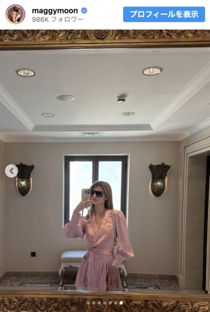 マギーが「ドバイきてます また色々吸収して帰りますっ!」と投稿したのは自身のオフショット。写真には、ガウン風のピンクワンピースを着てサングラスを付けたマギーがゴージャスな内装の建物の中で佇む様子が収められている。