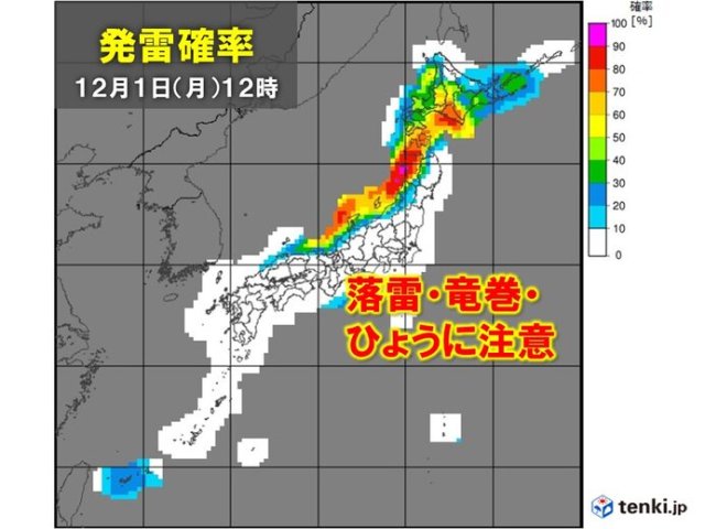 今日12月1日は、前線を伴った低気圧が日本海を発達しながら進んでいます。低気圧や前線に向かって流れ込む暖かく湿った空気や上空の寒気の影響で、北日本から西日本の日本海側を中心に大気の状態が非常に不安定で、発達した雷雲が北海道や東北、北陸地方を通過しています。