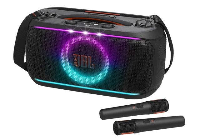 大型サイズでパワフルな重低音を再生。さらに本体がライトアップされるギミックで世界中で人気のシリーズ最新モデル。本製品にはマイクが2本付属され、スマホと連携してカラオケもOK。