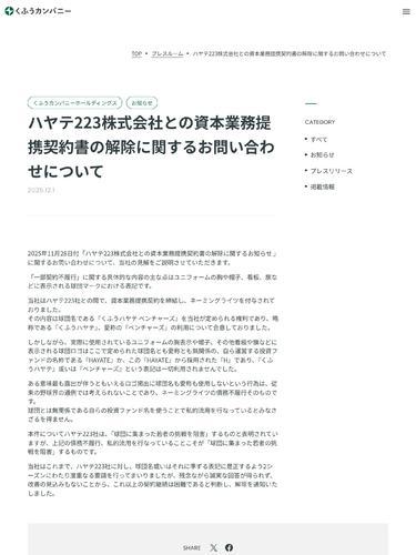 同社は11月28日に「くふうカンパニーホールディングスから資本業務提携契約の解除」を通知。これに対し、球団側は30日に「当社に債務不履行は存在せず、当社は本契約を適切に全う」と反論していた。