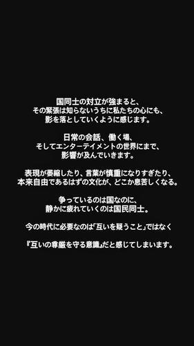続けて「争っているのは国なのに、静かに疲れていくのは国民同士」と指摘。「今の時代に必要なのは『互いを疑うこと』ではなく『互いの尊厳を守る意識』だと感じてしまいます」と思いをつづった。