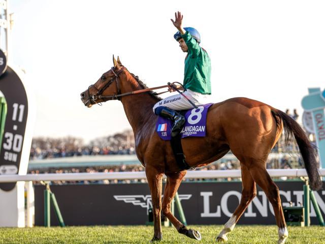 カランダガン(撮影:下野雄規) 府中開催の年内最後を飾るジャパンカップ(3歳上・GI・芝2400m)が30日、東京競馬場で行われ、中団を追走したM.バルザローナ騎手騎乗の4番人気カランダガン(セ4、仏・F.グラファール厩舎)がマスカレードボール(牡3、美浦・手塚貴久厩舎)との激しい叩き合いを制し、最後はアタマ差をつけて勝利した。勝ちタイムは2分20秒3(JRAレコード、良)。
