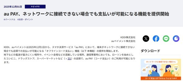 KDDIとauペイメントは12月1日、スマホ決済サービス「au PAY」で、端末がネットワークに接続できない状況でも店頭で支払いができる「オフラインコード支払い」機能の提供を始めた。地下や屋内施設の奥まった場所のように電波が届きにくい環境に加え、イベント会場や駅構内の混雑時、さらには通信障害の発生時でも決済が可能になり、ローソンをはじめとしたコンビニ、ドラッグストア、スーパーマーケットなどで利用できる。対象店舗は今後順次拡大する予定で、同社は日常から緊急時まで決済手段としての安定性を高める方針を示した。