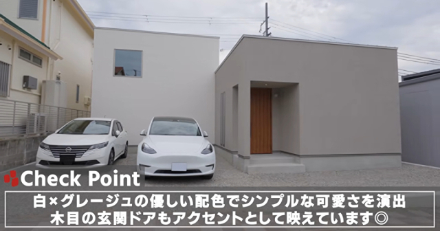 淡い色合いがステキな外観の平屋は、正面の駐車スペースに車を3台も止められるほど、ゆとりたっぷり。玄関に入ると、段差の下の間接照明が足元をオシャレに照らしてくれます。スリット窓からも自然光が入り、思った以上の広さを感じます。