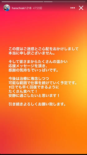 「この度はご迷惑とご心配をおかけしまして本当に申し訳ございません。そして皆さまからたくさんの温かい応援メッセージを頂き、感謝の気持ちでいっぱいです」と書き出した。「今後は治療に専念しつつ 可能な範囲で仕事を続けていく予定です。1日でも早く回復できるようにたくさん食べて! 安静に過ごしたいと思います! 引き続きよろしくお願い致します」と締めくくった。