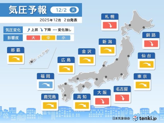 今日2日は頭痛やめまいにご注意を 全国的に気圧が下がる 影響度「大」の所も