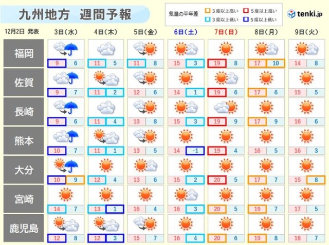 明日3日の最高気温は九州北部で9〜10℃、九州南部で13℃前後の見込みです。昨日までの小春日和から日中の気温は10℃前後も下がり、急に真冬並みの寒さになります。季節風も強く吹き、気温以上に寒く感じられますので、冬物のコートや上着が活躍しそうです。