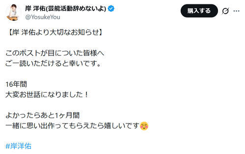 続けて、「残り1ヶ月間、"岸洋佑"として悔いのないように過ごしていきたいですし、さらに大きな夢に向かって1月以降も精一杯頑張っていきますので、今後とも応援のほどよろしくお願い致します」と呼びかけた。
