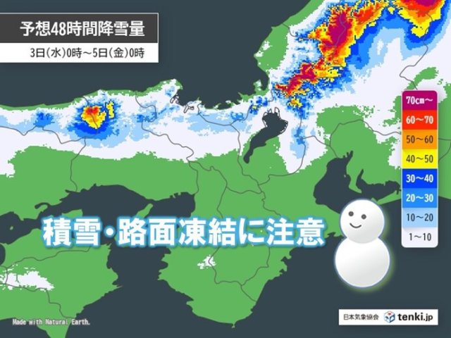 近畿地方は、明日3日から4日(木)にかけて、北部を中心に雪が降るでしょう。中部や南部でも所々で雪が降り、京都などの市街地でも雪が降る可能性があります。今シーズン初めての本格的な雪となります。積雪や路面凍結による交通障害に注意をしてください。