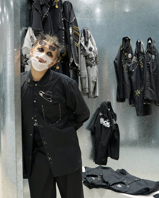 アイテムは、ジャケットやポンチョ、シャツなどを中心に展開。スタッズの一部をあえて経年で外れる仕様で取り付けたり、腕の動きを損なわないよう袖のカーブに合わせて安全ピンを取り付けるなど、パンクスのリアルな着こなしを追求しながらも繊細に作り込んだ。また、「ブラック コム デ ギャルソンは、異なる世代の人たちが一緒に楽しめる共通言語だと思う」という想いから、若年層でも手に取りやすいTシャツを用意。通常は展開していないフロントロゴのデザインを、初のダブルネーム形式で発表した。安全ピンを通すTシャツの菊穴は、バジョウとチームスタッフが自ら開けたものだという。