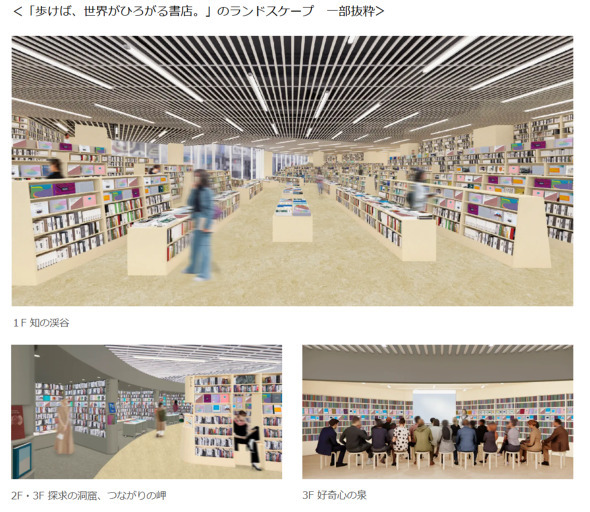 新店舗のコンセプトは「歩けば、世界がひろがる書店。」。本を通じてあらゆる世界の入り口となる、顧客の人生の転機のきっかけとなる書店を目指す。