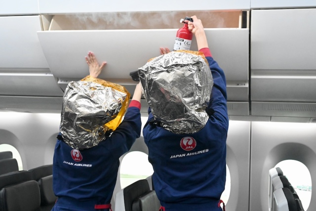 羽田空港にある訓練施設では12月2日、機内でモバイルバッテリーが発熱・発火した場合の対処手順を客室乗務員がデモンストレーションした。収納棚に入れられたモバイルバッテリーが発火した状況を想定したデモでは、防煙フードを着用した客室乗務員が消火器で消火し、水をかけて冷却。その後、ゴミ箱に水没させる一連の対応を再現した。