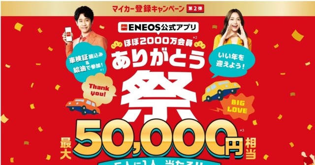画像提供:マイナビニュースENEOSは12月1日、「ENEOS公式アプリ ほぼ2000万会員 ありがとう祭」キャンペーンを開始した。同日から2026年1月5日までの期間中、ENEOSのサービスステーションで公式アプリの「マイカー機能」を登録して給油を行った利用者を対象に、抽選で最大5万円相当の「えらべるPay」などが当たる。