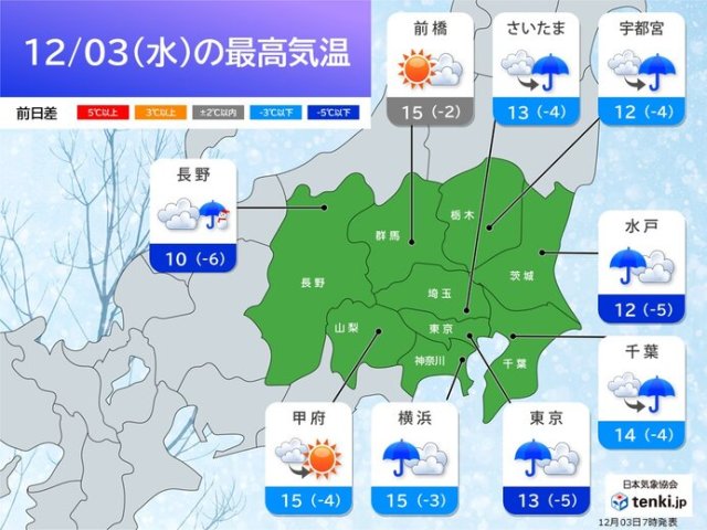 予想最高気温は、東京都心は13℃、横浜市と前橋市は15℃、水戸市と宇都宮市は12℃と、昨日2日(火)より低いでしょう。日中は北よりの風が次第に強まるため、実際の気温より寒く感じられそうです。なお、夜は寒気の影響で、朝より冷え込む所が多くなります。雨や風を通しにくいコートやマフラー、ストールなどで暖かくしてお過ごしください。