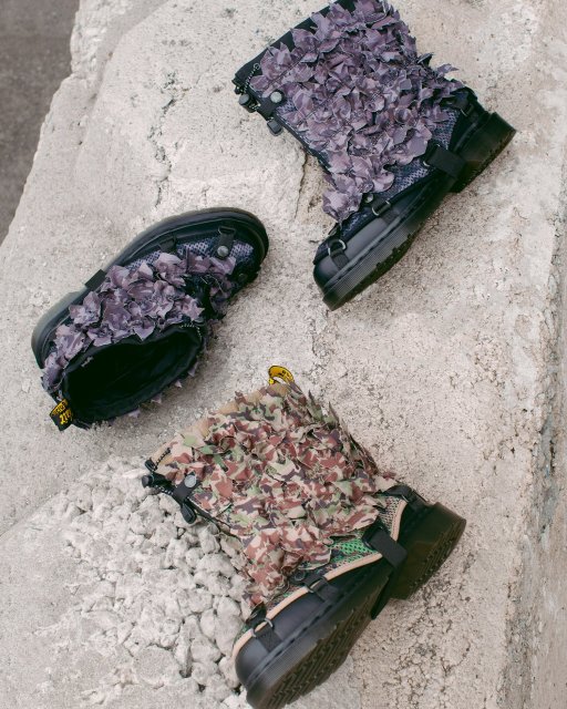 コラボは、ドクターマーチンのアイコンシューズである8ホールの「1460ブーツ」と3ホールの「1461シューズ」をベースに製作。リーフ型にレーザーカットされた⽣地を、カモフラージュ柄のメッシュ⽣地に重ねた構造のギリーカモレイヤーが付属する。ギリーカモレイヤーは、靴本体のウェルトラインに沿って並ぶDリングで固定可能で、着脱することによって違ったスタイルを楽しめる仕様となっている。