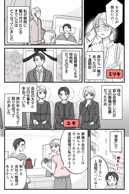 私(ミヅキ、28歳)は結婚1年目の会社員。夫(カズヤ、30歳)と2人暮らしです。私の父(トモヒロ、58歳)は経営者で、姉(ユキ、33歳、既婚)が父の仕事を手伝っています。母(サトミ、60歳)はずっと専業主婦で、父の仕事に関わったことがありません。私は実家近くに住んでいるため、結婚してからも時々実家に顔を出しています。先日も実家へ行って、両親との食事を楽しみました。それなのに……突然父との別れがやってきたのです。