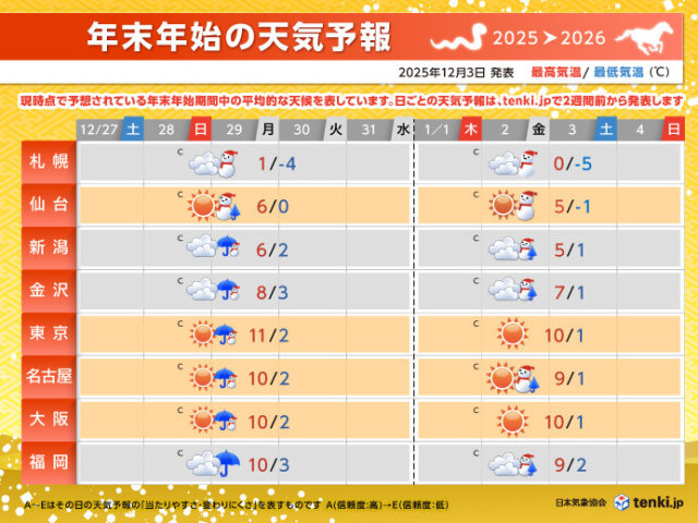 日本気象協会は、2025年から2026年にかけての年末年始の天気予報を発表しました。