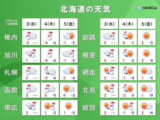 明日(4日)は寒さが強まり、道北や道央、オホーツク海側を中心に最高気温でも氷点下の所が多くなる見込みです。札幌の最高気温は-2℃で今シーズンはじめての真冬日となりそうです。札幌で初めて真冬日となる日は、例年で12月2日(過去30年間平均)で、ほぼ例年並みということになります。その他の都市の初真冬日は例年で、函館が12月5日、帯広12月6日、釧路12月10日、網走12月1日などですが、12月3日時点でまだ真冬日となっていません。稚内と旭川ではともに11月18日にシーズン初の真冬日となり、こちらは例年より一週間ほど早くなりました。明日(4日)は各地で寒くなるため、しっかりとした寒さ対策を心掛けましょう。また、路面凍結など車を運転する際も注意が必要です。