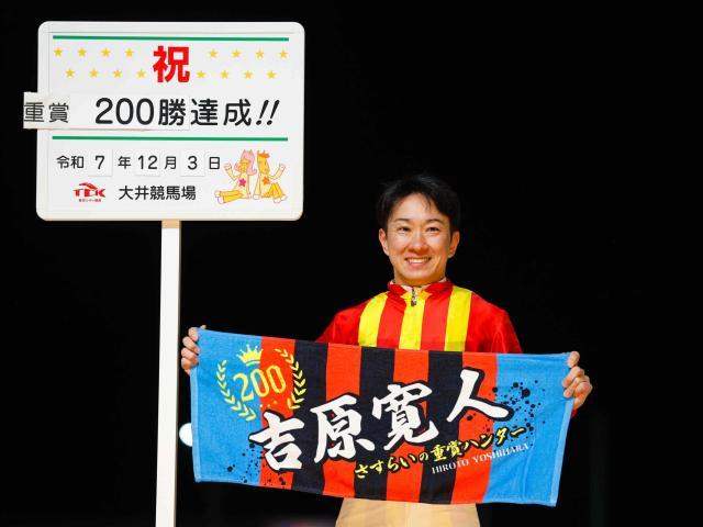 重賞200勝を達成した吉原寛人騎手(撮影:高橋正和) 吉原寛人騎手(金沢・加藤和義厩舎所属)が3日、大井競馬場で行われた勝島王冠(3歳上・SII・ダ1800m)をキングストンボーイ(セ7、大井・渡辺和雄厩舎)に騎乗して制し、前人未踏の地方重賞200勝を達成した。