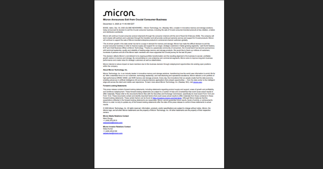 ¡¡ÊÆMicron Technology¤Ï12·î3Æü¡Ê¸½ÃÏ»þ´Ö¡Ë¡¢¾ÃÈñ¼Ô¸þ¤±¥¹¥È¥ì¡¼¥¸¡¦¥á¥â¥ê¥Ö¥é¥ó¥É¡ÖCrucial¡×»ö¶È¤«¤éűÂह¤ë¤Èȯɽ¤·¤¿¡£AI¤ò½ä¤Ã¤Æ¥Ç¡¼¥¿¥»¥ó¥¿¡¼¤Ë¤ª¤±¤ë¥á¥â¥ê¡¦¥¹¥È¥ì¡¼¥¸¤Î¼ûÍפ¬Áý²Ã¤·¤Æ¤ª¤ê¡¢À®Ä¹Ê¬Ìî¤Ë¥ê¥½¡¼¥¹¤ò³ä¤ê¿¶¤ë¤È¤·¤Æ¤¤¤ë¡£