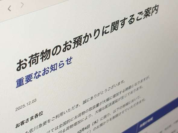 佐川急便は12月3日、荷物の増加により配送遅延が生じているとして、12月4日に荷物の預かりを制限すると発表した。今年は「予測を大きく上回る荷物増加」がみられるとしている。