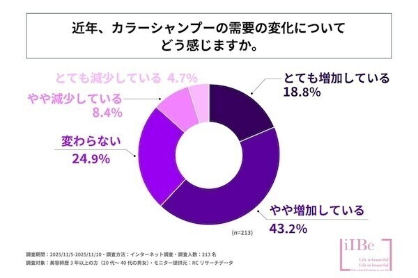 まず、「近年、カラーシャンプーの需要の変化についてどう感じるか」を尋ねる設問への回答では、1位が「やや増加している」で43.2%、2位が「変わらない」で24.9%、3位が「とても増加している」で18.8%という結果になった。