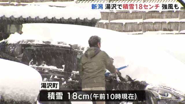 湯沢町では午前10時現在で18センチの積雪を観測。住民が雪かきに追われました。