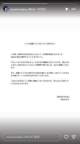 青山は「いつも応援してくださっている皆さまへ この度、2025年12月31日をもちまして、5年間お世話になりましたApollo Bayを退所することとなりました」と発表した。