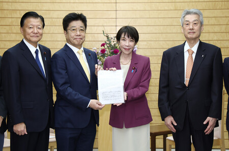 自民党の「国民医療を守る議員の会」会長の加藤勝信前財務相(中央左)から申し入れを受ける高市早苗首相(同右)=4日午後、首相官邸 高市早苗首相は4日、日本維新の会の藤田文武共同代表と首相官邸で面会し、社会保障制度改革に関する提言書を受け取った。市販薬と似た「OTC類似薬」の保険適用見直しで「数千億円規模の医療給付削減」を図ることなどが柱。首相は「自民党と維新の協議を見守りたい」と応じた。
