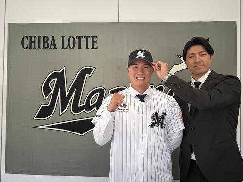もともと二刀流だったが昨年から投手1本に専念。「経験もこれから積めるとは思ってるので、そういう部分ではたくさん成長できる部分はある」と自信をのぞかせた。最速161キロ右腕は「160キロは最低でも出しながら、日本人最速の165を目指して」と目標を掲げた。背番号は「60」に決まった。