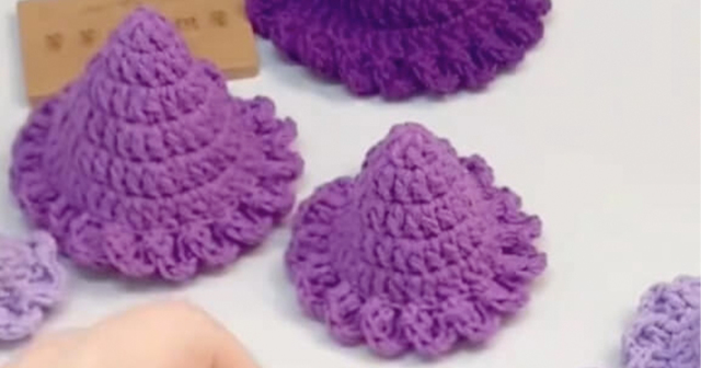 今回の動画でミンさんが用意したのはかぎ針で編んだ小さなとんがり帽子のような円錐形のパーツ。濃い紫色のものが2つにそれよりもやや色の薄い紫色のものが2つ。そしてさらに薄くて淡い紫色のものが3つと、計7つの“とんがり帽子”を使います。