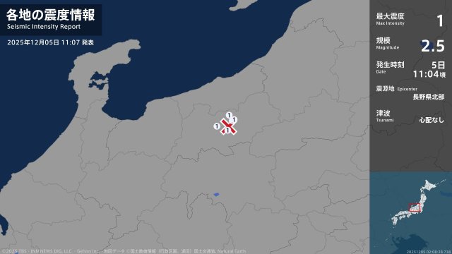 気象庁によりますと、震源地は長野県北部で、震源の深さはごく浅い、地震の規模を示すマグニチュードは2.5と推定されます。