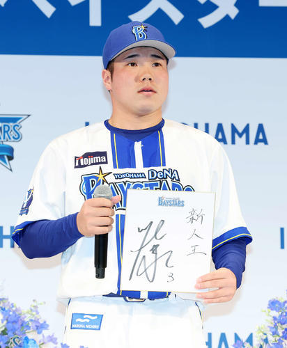 DeNAドラフト1位の青学大・小田康一郎内野手(22)が背番号3に特大の期待を背負った。新入団選手発表会で今季までオースティンが背負い、かつては梶谷隆幸氏や高木豊氏がつけた1ケタ番号のユニホームに袖を通した。所信表明に「新人王」と記したルーキーは「重荷に感じず、自分らしいプレーをして、背番号に見合った活躍ができれば」と力を込めた。
