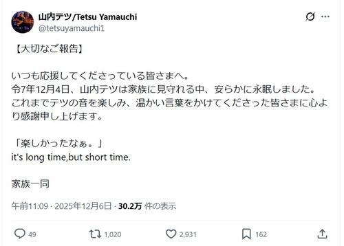 山内さんのX(旧ツイッター)に「家族一同」名義で、「大切なご報告」と題し、「いつも応援してくださっている皆さまへ。令7年12月4日、山内テツは家族に見守れる中、安らかに永眠しました」と伝えた。