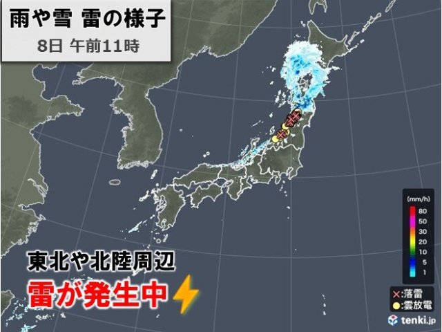 今日8日は低気圧や前線が北日本付近を通過する見込みです。すでに北海道では雪が降り、東北から山陰にかけては雨が降っています。また東北の日本海側や北陸では雷が発生し、1時間に10ミリ以上のやや強い雨の降っているところもあります。