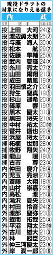 西武の現役ドラフトの対象になりえる選手のリストは表の通り。(※日刊スポーツ調べ。推定年俸に基づき、未更改選手は除く。指名対象から外れる複数年契約を結んでいる選手が含まれている可能性もある)