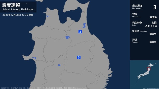 8日午後11時33分ごろ、青森県、岩手県で最大震度3を観測する地震がありました。
