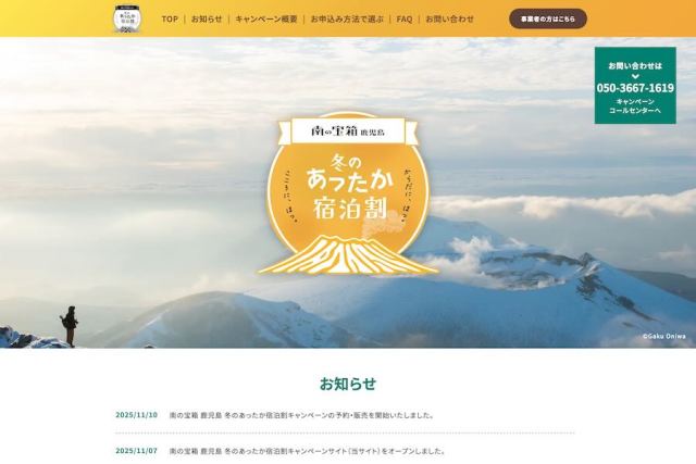 鹿児島県は、「南の宝箱 鹿児島 冬のあったか宿泊割キャンペーン」を11月10日から2026年2月28日まで実施している。