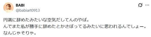 今回の投稿では、詳細は記していないものの「円満に辞めたみたいな空気だしてんのやば」と意味深長に切り出し、「んでまた私が勝手に辞めたとかさぼってるみたいに思われるんでしょー。なんじゃそりゃ」と不信感をあらわに。フォロワーからは「辞めたのではなく休演ですよね?実際、色々なご苦労があったようですし…BABIさんの気持ちや都合が最優先ですが個人的にはいつか復帰を願ってます」「スナラジですよね。全然、やめたと思ってないです。お休み中かと」「子育てっていう大仕事してるじゃん!サボってないじゃん!バビちゃんいつでも待ってる!!」といったコメントが寄せられた。