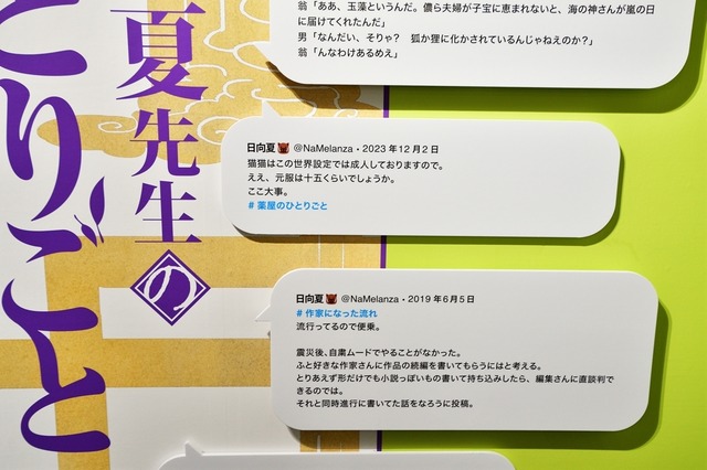 ほかにも会場に来た人だけが目撃できる「【???】」コーナーや「イラストレーターしのとうこ画回廊」、入場特典小説の冒頭が展示された「書き下ろし小説を読む」、猫の毛毛と遊びながら楽しめるスタンプラリーなど見どころが盛りだくさん。原作小説を掘り下げる展示らしく、全体的に読み応えたっぷりに仕上がっていました。