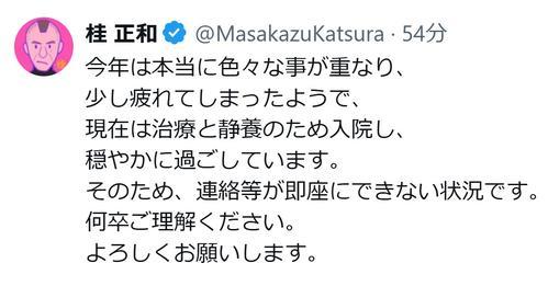 桂氏はこの度「今年は本当に色々な事が重なり、少し疲れてしまったようで、現在は治療と静養のため入院し、穏やかに過ごしています」と打ち明けた。「そのため、連絡等が即座にできない状況です。何卒ご理解ください。よろしくお願いします」と締めくくった。