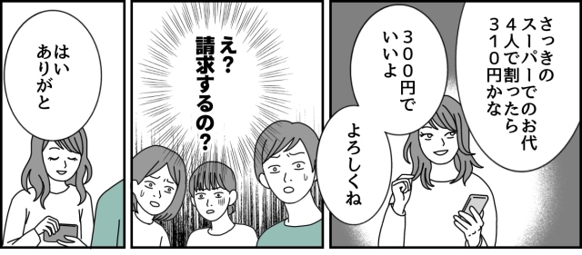 他の友人たちも一瞬固まったように見えましたが、財布からお金を取り出そうとするので、私もお金を出します。その後は気を取り直して、みんなで持ち寄ったお菓子と買ってきたドリンクを囲みながら楽しく談笑しました。