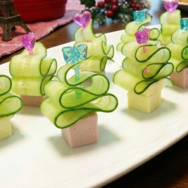 きゅうりをピーラーでスライスしたら、かわいいピックにくねくねと段々幅が広くなるように刺していくだけ。ツリーの幹の部分には、プロセスチーズや魚肉ソーセージなど、お好みの具材を刺します。これで、鮮やかなグリーンのクリスマスツリーのできあがりです。