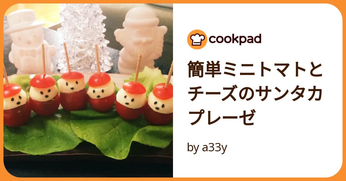 ミニトマトとモッツァレラチーズ、黒ごまという3つの材料だけで、かわいらしいサンタさんが作れちゃいます。作り方もとっても簡単。モッツァレラチーズを半分、ミニトマトを1/4に切ったら、ピックにミニトマト、チーズ、ミニトマトの順で刺して、黒ごまで目と口を描くだけ。あっという間にキュートなサンタカプレーゼの完成です!