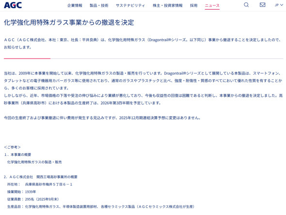 AGCは12月8日、スマートフォンやタブレット向け化学強化用特殊ガラス「Dragontrail」シリーズ事業から撤退すると発表した。市場価格下落と受注低迷により収益性が悪化し、回復が困難と判断した。