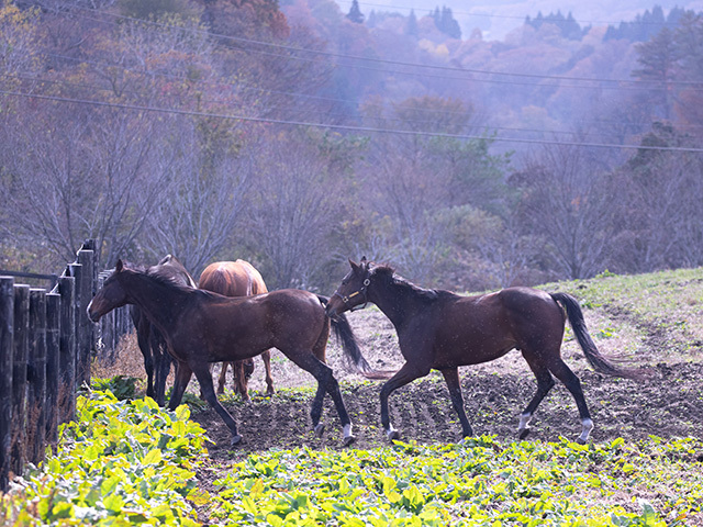 まず目に飛び込んできたのは、広がる草原と背後にそびえる山々。澄んだ空気を胸いっぱいに吸い込みながら、ゆったりとした時間が流れ始めるのを感じた。最初に向かったのは放牧地。そこにはジャガーメイル、ブライトエンブレム、ティーハーフ、キメラヴェリテの4頭がいた。それぞれ天皇賞(春)、札幌2歳S、函館スプリントS、北海道2歳優駿を制した実績馬たちだ。これだけの活躍馬が揃って草を食べる姿に驚くとともに、“群れる”習性からか、寄り添うように行動している様子が愛らしかった。