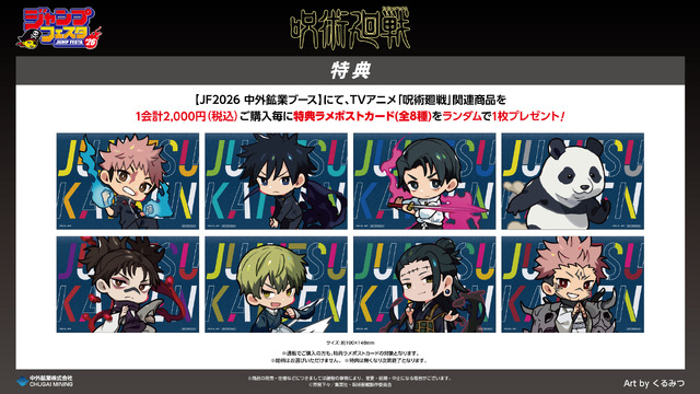 また、中外鉱業ブースにてテレビアニメ「呪術廻戦」ジャンプフェスタ2026関連商品を1会計2,000円(税込)購入すると、特典ラメポストカード(全8種)がランダムで1枚もらえる。
