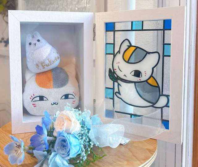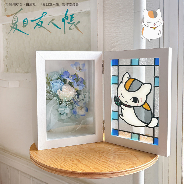 最大の特徴は、飾るスペースや気分に合わせて形状を変えられる「ブック型(見開き)」の構造。フレームを広げると、右側に「ニャンコ先生のグラスアート」、左側に「お花畑のブーケ」が並び、第11話の情景がパノラマのように広がる。窓辺に置けば、グラスアートが陽の光を取り込み、ブーケと共にキラキラと輝くのが特徴だ。