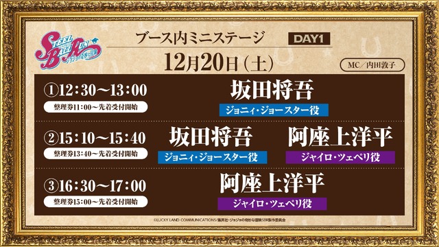 会場ではDAY1、DAY2ともに、ジョニィ・ジョースター役の坂田将吾、ジャイロ・ツェペリ役の阿座上洋平、スティーブン・スティール役の三宅健太、ルーシー・スティール役の高橋李依らキャストが登壇するブース内ミニステージが開催予定。